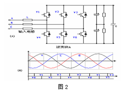 電機一般工作在電動狀態(tài)下,逆變塊A作為整流用,在發(fā)電狀態(tài)下,作為逆變回饋用,電機發(fā)電時,通過逆變塊B中IGBT反并聯(lián)的二極管整流,整流電壓加在母線電容C上,如果發(fā)電功率較大時,母線電壓就會上升,直接威脅到整個系統(tǒng)的安全,這樣就需要啟動逆變塊A將多余的能量經(jīng)過電感電容回饋到電網(wǎng)。電感將承受直流母線電壓和電網(wǎng)線電壓的差值,同時電感將緩沖諧波的無功功率。
