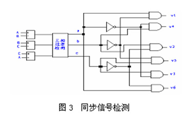 設(shè)定逆變塊A中的功率器件的開關(guān)狀態(tài)要求與電網(wǎng)同步,同步信號如圖2中(B)所示,下面是一種簡單的同步信號控制方式,可以簡單的得到V1-V6的同步方波脈沖。
