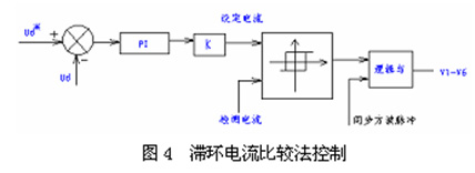 回饋制動時,回饋電流變化速度較快,就需要采用有效的控制方式,一般采用滯環(huán)電流比較法控制,見如下框圖4所示: