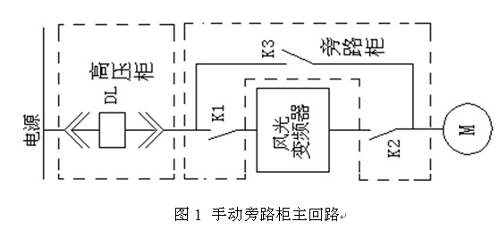 為防止變頻器檢修或故障對生產的影響,本次采用的JD-BP38-355F型高壓變頻器采用“一拖一”控制方式,配置手動工頻旁路,主回路接線如圖1所示: