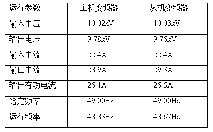 如在山西省某洗煤廠,雙機拖動皮帶輸送機系統中,每臺電機的額定功率為560kW,額定電壓為10kV,每臺電機均由單獨的變頻器驅動。控制方案采用本文所論述的方案,皮帶機系統能夠平穩地啟動、停機、以較高的效率變頻運行。其基本運行參數如下表所示,