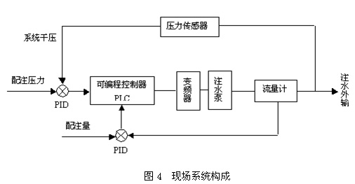 系統(tǒng)閉環(huán)控制過(guò)程如下:由智能傳感器對(duì)各運(yùn)行注水泵進(jìn)行實(shí)時(shí)數(shù)據(jù)監(jiān)控和處理,即采集和傳輸注水泵、站的運(yùn)行參數(shù),如:泵的排量Q單、電機(jī)電流I、泵進(jìn)、出口壓力P泵,注水站出口干壓P干、總排量Q總、平均單耗等,并將這些控制參數(shù)(Q單、I、P泵,P干、Q總、)與其期望值及泵本身的特性曲線進(jìn)行對(duì)比和優(yōu)化計(jì)算。其中,注水站干壓和總流量是系統(tǒng)所需監(jiān)測(cè)和控制的兩個(gè)最主要參數(shù)。本系統(tǒng)中,一方面在泵出口管線上安裝一只高可靠性壓力傳感器,將實(shí)測(cè)的壓力信號(hào)與系統(tǒng)的配注壓力(期望值)相比,并將其差值送往過(guò)程參數(shù)調(diào)節(jié)器(PID)進(jìn)行比例和積分運(yùn)算,最后將輸出結(jié)果送給可編程控制器(PLC);另一方面在泵入口管線上安裝一只流量計(jì),用于監(jiān)測(cè)系統(tǒng)實(shí)際總流量,將該值與系統(tǒng)配注量的差值再進(jìn)行一次PID整定,最后將輸出結(jié)果送給PLC。PLC根據(jù)所接收的兩個(gè)PID整定信號(hào),利用模糊推理的方法,在滿足系統(tǒng)干壓的前提下,系統(tǒng)及時(shí)自動(dòng)調(diào)整高壓變頻器的輸出頻率從而控制變頻泵的轉(zhuǎn)速。由離心泵原理知,泵轉(zhuǎn)速的變化可引起相應(yīng)的排量變化,通過(guò)頻率的變化以達(dá)到期望的排量值。通過(guò)上述閉環(huán)控制,使系統(tǒng)的實(shí)際壓力和排量與系統(tǒng)的配注壓力和配注量相接近。系統(tǒng)設(shè)計(jì)為閉環(huán)控制系統(tǒng),流量和壓力為系統(tǒng)的兩個(gè)主要參數(shù),將系統(tǒng)實(shí)測(cè)的流量和壓力信號(hào)與地質(zhì)要求的流量和壓力(期望值)進(jìn)行雙PID調(diào)節(jié);通過(guò)模糊推理的方法自動(dòng)尋優(yōu)控制,根據(jù)推理結(jié)果,系統(tǒng)及時(shí)自動(dòng)調(diào)整高壓變頻器的輸出,并自動(dòng)計(jì)算出變頻器的較佳運(yùn)行頻率。