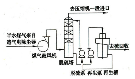造氣 ->半水煤氣脫硫 ->壓縮機1段 ->變換 -> 變換氣脫硫 -> 壓縮機2段 ->脫碳 -> 精脫硫 ->甲烷化 ->壓縮機3,4,5段 ->氨合成 ->產品NH3