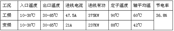 根據生產情況,風機運行30HZ左右就能滿足了生產工藝要求;運行轉速在額定轉速的60%左右。由于電機為水冷卻,在低轉速下發熱量并沒有提高,完全滿足了工況運行。