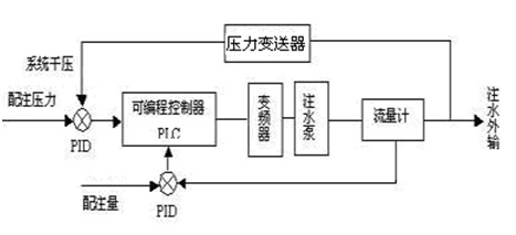 現(xiàn)場系統(tǒng)構成框圖如圖3所示。系統(tǒng)閉環(huán)控制過程如下:由智能壓力變送器對各運行注水泵進行實時數(shù)據(jù)監(jiān)控和處理,即采集和傳輸注水泵、站的運行參數(shù),如:泵的排量Q單、電機電流I、泵進、出口壓力P泵,注水站出口干壓P干、總排量Q總、平均單耗等,并將這些控制參數(shù)(Q單、I、P泵、P干、Q總)與其期望值及泵本身的特性曲線進行對比和優(yōu)化計算。其中,注水站干壓和總流量是系統(tǒng)所需監(jiān)測和控制的兩個最主要參數(shù)。本系統(tǒng)中,一方面在泵出口管線上安裝一只高可靠性壓力變送器,將實測的壓力信號與系統(tǒng)的配注壓力(期望值)相比,并將其差值送往過程參數(shù)調(diào)節(jié)器(PID)進行比例和積分運算,最后將輸出結果送給可編程控制器(PLC);另一方面在泵入口管線上安裝一只流量計,用于監(jiān)測系統(tǒng)實際總流量,將該值與系統(tǒng)配注量的差值再進行一次PID整定,最后將輸出結果送給PLC。PLC根據(jù)所接收的兩個PID整定信號,利用模糊推理的方法,在滿足系統(tǒng)干壓的前提下,系統(tǒng)及時自動調(diào)整高壓變頻器的輸出頻率從而控制變頻泵的轉速。由柱塞泵原理知,泵轉速的變化可引起相應的排量變化,通過頻率的變化以達到期望的排量值。通過上述閉環(huán)控制,使系統(tǒng)的實際壓力和排量與系統(tǒng)的配注壓力和配注量相接近。系統(tǒng)設計為閉環(huán)控制系統(tǒng),流量和壓力為系統(tǒng)的兩個主要參數(shù),將系統(tǒng)實測的流量和壓力信號與地質要求的流量和壓力(期望值)進行雙PID調(diào)節(jié);通過模糊推理的方法自動尋優(yōu)控制,根據(jù)推理結果,系統(tǒng)及時自動調(diào)整高壓變頻器的輸出,并自動計算出變頻器的較佳運行頻率。