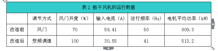(2)節能效果計算 固陽礦球團廠鼓干風機變頻改造后,取得了顯著的節能效果,改造前風機采用液耦啟動,風門調節,風門的開啟經常在70%左右;改造后,液耦去掉,采用聯軸器風機與電機直接相聯接,風門全開,電機變速運行。因現場工況變化不是很大,變頻調速系統一般運行在41Hz左右,與調節檔板時的消耗功率大大減少,節電效果與經濟效益顯著,變頻改造前后,鼓干風機的運行數據如表2所示。
