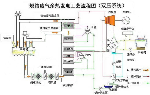 目前,國內燒結廢氣余熱回收利用主要有三種方式:一是直接將廢煙氣經過凈化后作為點火爐的助燃空氣或用于預熱混合料,以降低燃料消耗,這種方式較為簡單,但余熱利用量有限,一般不超過煙氣量的10%;二是將廢煙氣通過熱管裝置或余熱鍋爐產生蒸汽,并入全廠蒸汽管網,替代部分燃煤鍋爐;三是將余熱鍋爐產生蒸汽用于驅動汽輪機組發電。
