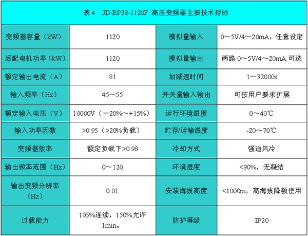 JD-BP38-1120F高壓變頻器技術(shù)指標(biāo)如表4所示。