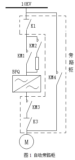根據用戶現場的實際情況,旁路柜采用了一拖一工變頻自動轉換方案。如圖1所示。旁路柜中,共有2個高壓隔離開關和2個真空接觸器,為了確保不向變頻器輸出端反送電,KM3與KM4采用電氣互鎖。當K1、K3、KM1和KM3閉合,KM4斷開時,電機變頻運行;當KM1、KM3斷開,KM4閉合時,電機工頻運行,此時變頻器從高壓中隔離出來,便于檢修、維護和調試。