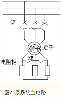 原系統(tǒng)是采用繞線電機(jī)串電阻降壓?jiǎn)?dòng),然后全壓運(yùn)行的方式進(jìn)行控制的,如圖2示。