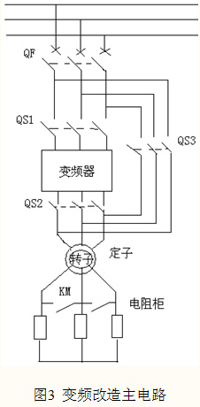 變頻改造后的系統(tǒng)主電路如圖3示,從變頻器的輸入隔離開關(guān)QS1、輸出隔離開關(guān)QS2各取一對(duì)動(dòng)斷觸點(diǎn)串入電阻柜內(nèi)接觸器KM的合閘回路,保證變頻啟動(dòng)時(shí)切除電阻啟動(dòng)。