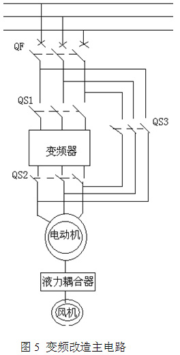 變頻改造后主電路如圖5示,把變頻器串在原系統(tǒng)的高壓真空斷路器與電動(dòng)機(jī)之間,采用三個(gè)隔離開關(guān)進(jìn)行工變頻轉(zhuǎn)換。變頻運(yùn)行時(shí)閉合QS1、QS2,斷開QS3,工頻運(yùn)行時(shí)閉合QS3,斷開QS1、QS2,QS2與QS3在電氣、機(jī)械方面雙互鎖,保證電氣回路的安全。考慮到變頻器調(diào)試期間的穩(wěn)定性,先保留液力耦合器,變頻運(yùn)行時(shí)將液力耦合器調(diào)到最大。
