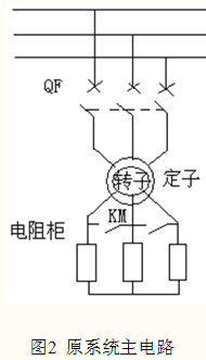 原系統是采用繞線電機串電阻降壓啟動,然后全壓運行的方式進行控制的,如圖2示。