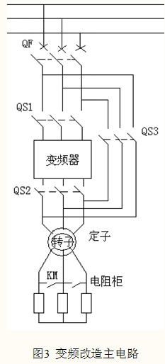 變頻改造后的系統主電路如圖3示,從變頻器的輸入隔離開關QS1、輸出隔離開關QS2各取一對動斷觸點串入電阻柜內接觸器KM的合閘回路,保證變頻啟動時切除電阻啟動。