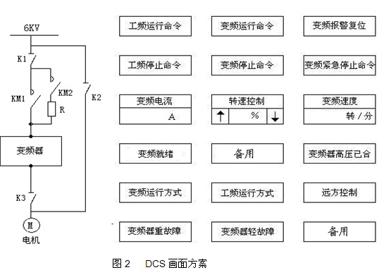 如圖2所示,利用DCS控制系統的預留點,設計高壓變頻改造控制、運行監視系統,系統包括工、變頻的運行、停止命令按鈕;轉速調節按鈕;變頻器復位按鈕、緊急停止按鈕;變頻器運行電流、電機轉速顯示;高壓柜以及變頻合閘顯示;變頻器故障報警顯示。