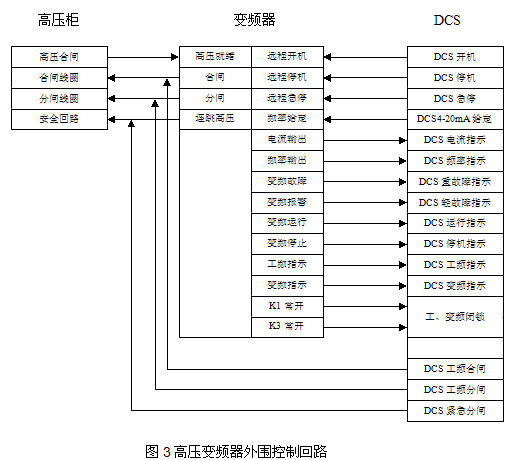 如圖3所示,DCS系統輸出 4-20mA電流信號控制JD-BP37高壓變頻調速系統的運行頻率, 來控制電機的運行轉速。JD-BP37高壓變頻調速系統反饋4-20mA電流信號指示JD-BP37高壓變頻調速系統的輸出頻率、輸出電流。JD-BP37高壓變頻調速系統同時接收DCS控制系統的啟動、停止、急停、復位控制信號,調整運行狀態。