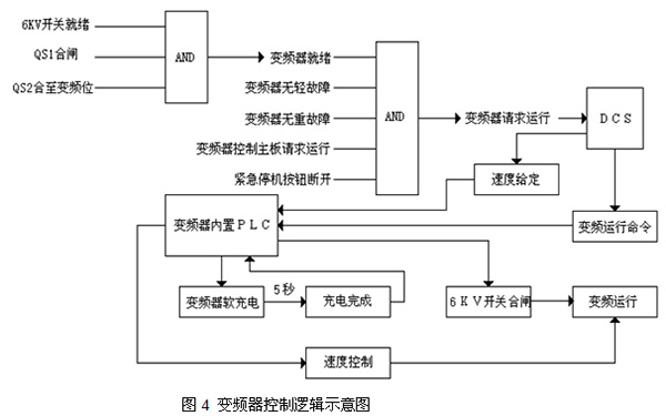 如圖4所示,當所有開機條件都具備后,DCS發出變頻運行命令,變頻器內置PLC發出“合閘”信號至6kV高壓柜,現場6kV小車開關合閘,變頻器進行軟充電,5S后充電完成,變頻器處于就緒狀態,由DCS給出4-20mA信號控制變頻器頻率來改變電機轉速。