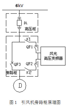 以變頻轉工頻自動旁路投入為例,介紹其過程:將變頻器“旁路投入”信號并聯于QF3合閘回路。變頻運行狀態下,若變頻器出現故障且自動投入允許,系統將首先分斷變頻器高壓輸入、輸出開關QF1和QF2,經過一定延時后,“旁路投入”閉合,即工頻旁路開關QF3合閘,電機投入電網工頻運行,并把旁路狀態信號發送給DCS。同時DCS邏輯自動將引風機轉為工頻相應風門調節方式。