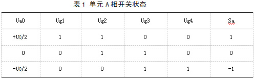三電平電路,每一相橋臂4個開關元件有三種正常的開關模式。以A相為例:Ug1和Ug2導通時,A相輸出+U0/2;Ug2和Ug3導通時,A相輸出零電平;Ug3和Ug4導通時,A相輸出-U0/2。如果用Sa、Sb、Sc分別表示各橋臂的開關狀態,每一橋臂都有三種開關狀態,如表1所列。
