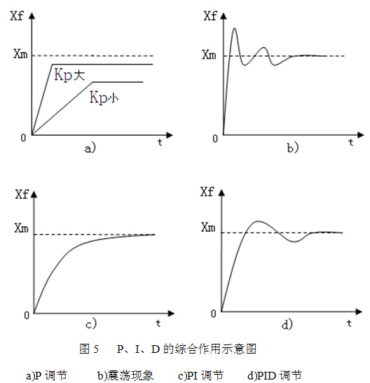 就是說(shuō),盡管Kp(Xm-Xf)一下子增大(或減小)很多,但Xa只能在“積分時(shí)間”內(nèi)逐漸的增大或減小,從而減緩了Xa的變化速度,防止了振蕩。積分時(shí)間越長(zhǎng),Xa的變化越緩慢。只要偏差不消除,Xm-Xf≠0,積分就不停止,從而有效的消除靜差。如圖5(c)所示。