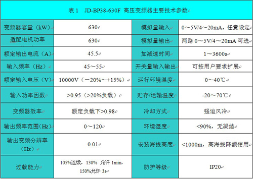 JD-BP38-630F高壓變頻器技術參數如表1所示。