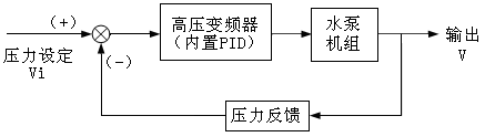 由于永州市零陵區自來水公司,對用水負荷需要在實際運行時進行精確調整和測量,因此采用的是恒壓供水系統,其工作原理如圖3所示,測量元件為壓力傳感器,將它設在水泵機組出水口,Vi為恒定供水壓力設定值,供水壓力V作為輸出量,構成閉環控制系統。變頻器內部的PLC采集供水壓力值V與用戶給定值Vi進行比較和運算,通過PID進行調整,將結果轉換為頻率調節信號送至變頻器,直至達到供水壓力的給定值Vi。不管系統供水流量如何變化,供水壓力值V始終維持在給定壓力值Vi附近。