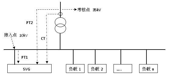 現(xiàn)場(chǎng)采用降壓式接入方式,10kVSVG通過(guò)變壓器接入35kV電網(wǎng),考核點(diǎn)在35kV側(cè),SVG通過(guò)并網(wǎng)變壓器接入電網(wǎng),變壓器接入點(diǎn)與考核點(diǎn)相同。如圖3所示。PT信號(hào)連接到PT1,并且二次接線(xiàn)端子PTA1與接入點(diǎn)電網(wǎng)一次端 子A必須是同一相;PTB1與接入點(diǎn)電網(wǎng)一次端子B必須是同一相,PTC1與接入點(diǎn)電網(wǎng)一次端子C必須是同一相。PT1用于SVG計(jì)算并網(wǎng)同步信號(hào),還用于計(jì)算考核點(diǎn)處的無(wú)功。