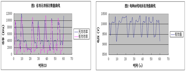 補償裝置未投運軋鋼機運行時有功、無功曲線如圖1所示,數據統計1分鐘,數據采樣間隔1次/1秒鐘。