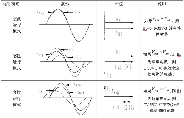 在交流電路中,電壓和電流的相位有三種情況,當負載是純電阻特性時,電壓和電流相位相同;當負載是(或含有)電感特性時,電壓相位超前電流相位;當負載是(或含有)容性特性時,電壓相位滯后電流相位。如圖3所示,基本原理就是將自換相橋式電路通過變壓器或者電抗器并聯在電網上,適當地調節橋式電路交流側輸出電壓的幅值和相位,或者直接控制其交流側電流就可以使該電路吸收或者發出滿足要求的無功電流,實現動態無功補償的目的,如表2所示。