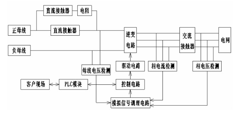 本設備在接收到總控裝置啟動信號,即啟動/退出信號的無源常開結點閉合后,經過控制回路動作,送出啟動完畢確認信號,即此無源常開結點閉合。總控裝置檢測到啟動完畢確認信號后,根據母線電壓幅值給出開機結點信號。結點閉合逆變裝置IGBT瞬間開通,進行能量回饋。逆變設備工作過程中,時刻接受總控裝置的控制信號并及時回復設備內接觸器、各個單元的工作狀態信號。圖6為整機的控制原理圖。